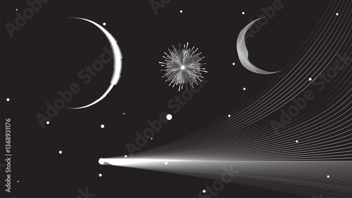 Wall mural : Star and moon and comet in outer space - futuristic landscape, with lines texture - space landscape w