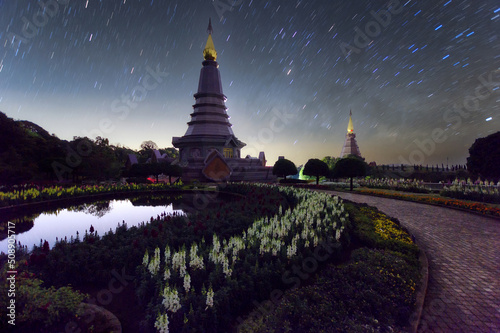Wall mural : Star trails moving over a sacred temple at doi inthanon national park, chiang mai, thailand -