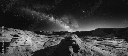 The watermark will not be included on Wall mural.: Starry black and white landscape featuring diverse textures with rocky formations in foreground unde
