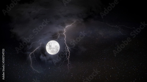 The watermark will not be included on Wall mural.: Starry sky moon on lightenning rainy night dramatic clouds nebula cosmic nature landscape weather fo
