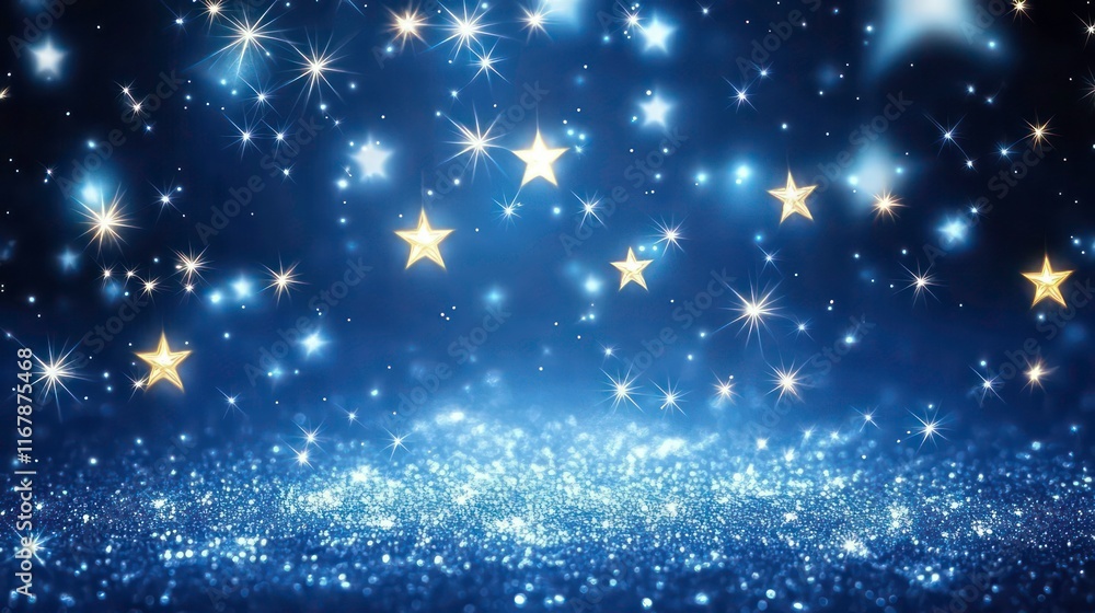 The watermark will not be included on Wall mural.: Stars trailing off into a gradient of blue, blending with tiny light bursts