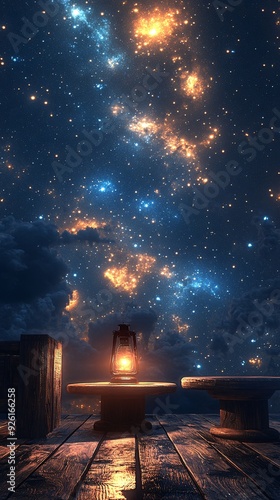 Wall mural stars twinkle in the night sky, illuminating an old wooden table with glowing lanterns on it. in fro - Wall murals Wall mural stars twinkle in the night sky, illuminating an old wooden table with glowing lanterns on it. in fro - Wall murals