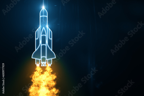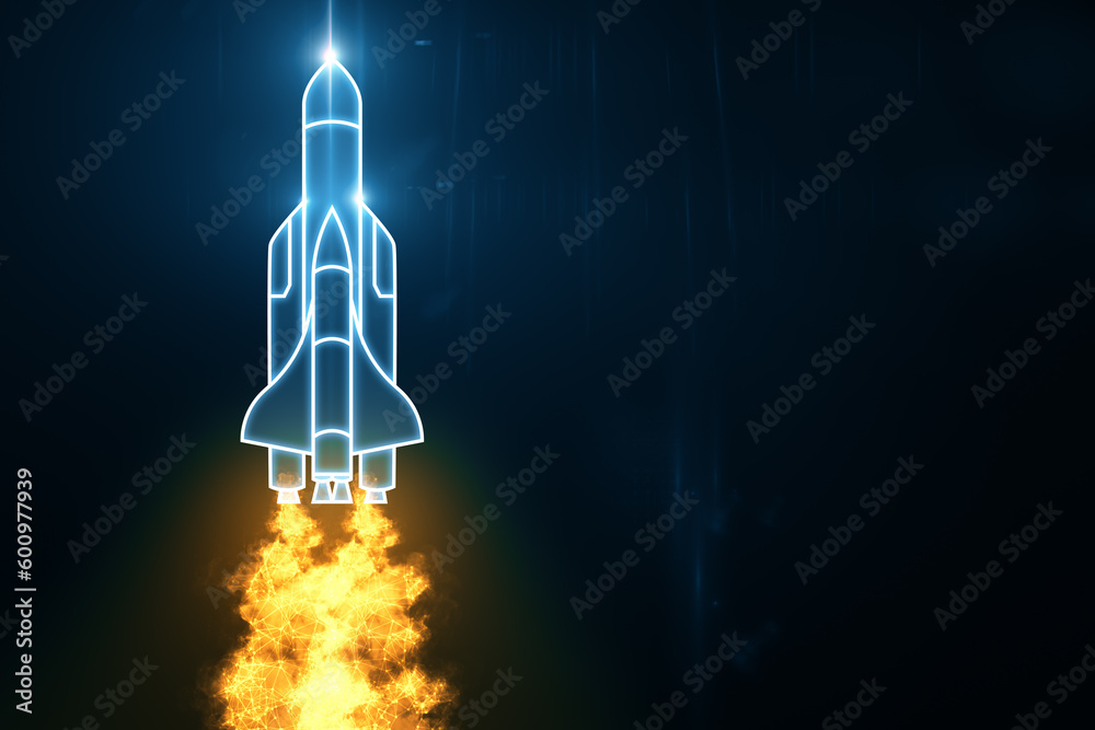The watermark will not be included on Wall mural.: Starting rocket with a flame in a neon style on a dark background - the beginning of the new business