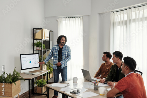 Wall mural : Startup cfo pointing at chart on whiteboard when talking in front of founders and investors
