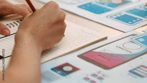 The watermark will not be included on Wall mural.: Startup company employee planning for user interface prototype for mobile application or website in