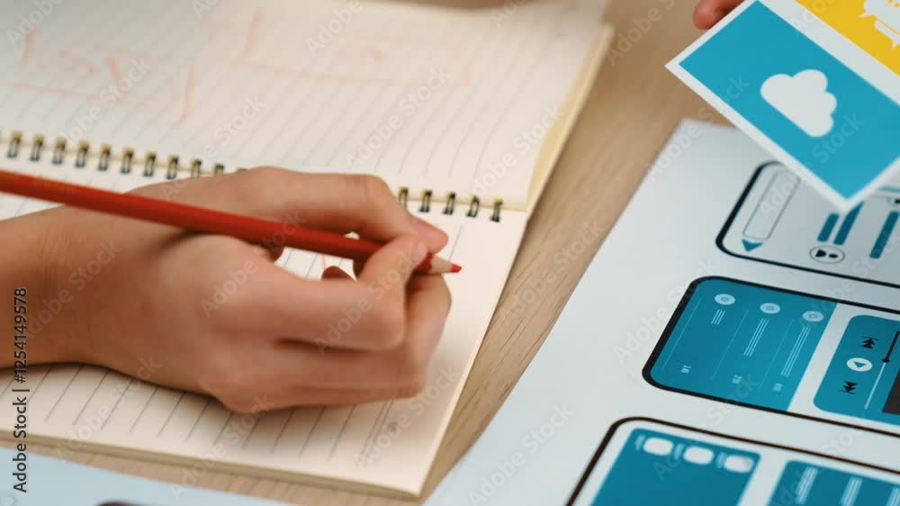 The watermark will not be included on Wall mural.: Startup company employee planning for user interface prototype for mobile application or website in