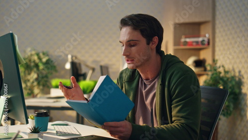 Wall mural startup guy reading notebook having video call office closeup. man making notes