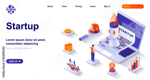 The watermark will not be included on Wall mural.: Startup isometric landing page - launching new business project isometry concept - development strateg