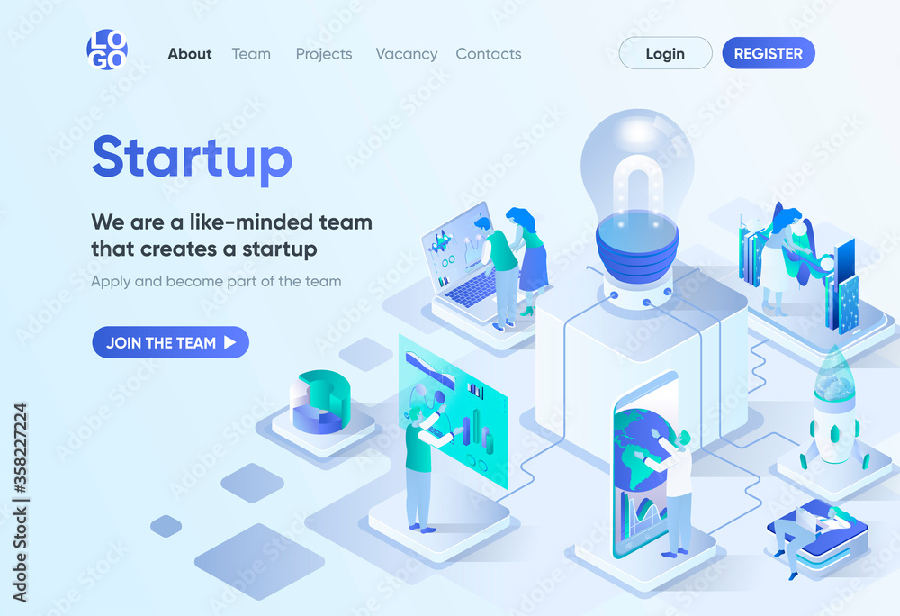 Wall mural : Startup project isometric landing page - startup founding, business idea generation and development -