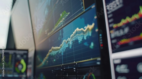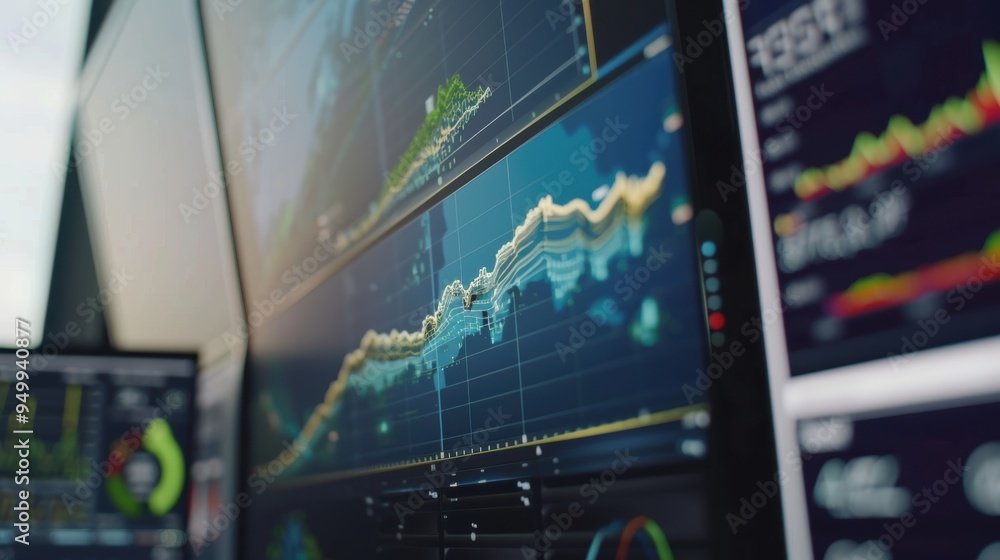 The watermark will not be included on Wall mural.: Stock market data and charts displaying on multiple screens in office