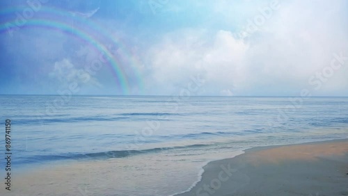 The watermark will not be included on Wall mural.: Storm's end double rainbow promise 4k loop features ocean waves crashing onto the shore with a light