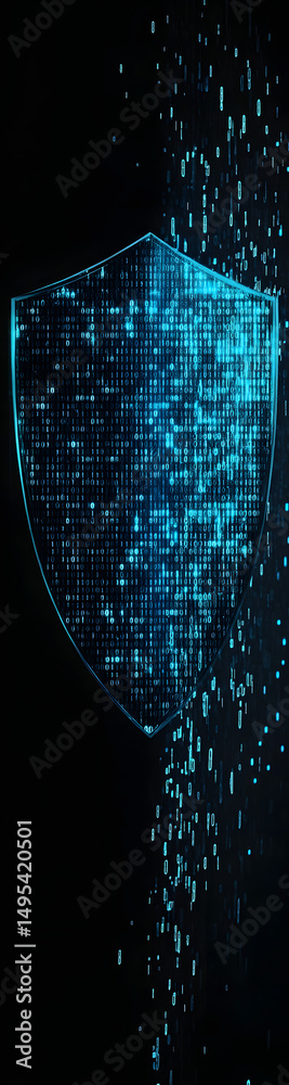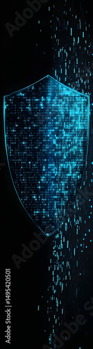 Wall mural : Streams of binary code flow seamlessly behind a robust shield emblem vertical banner - wide skyscrap