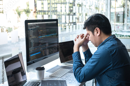 Wall mural : Stressed tired out of work, development programmer working in programming website a software and cod