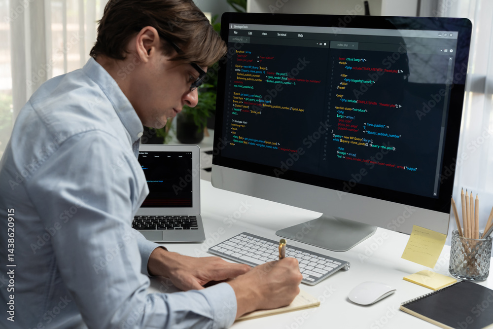 Wall mural : Stressful it developer analyzing online software development information on pc and laptop with codin