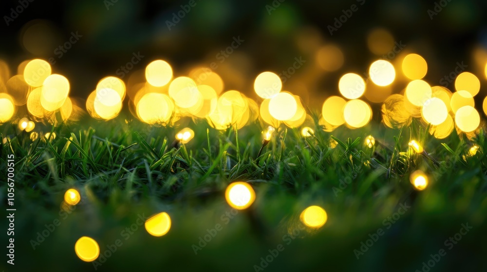 Wall mural : String lights illuminate green grass at night creating a beautiful bokeh effect in the background hi