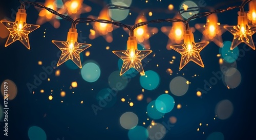 The watermark will not be included on Wall mural.: String lights in the shape of stars illuminate a dark background with bokeh effect