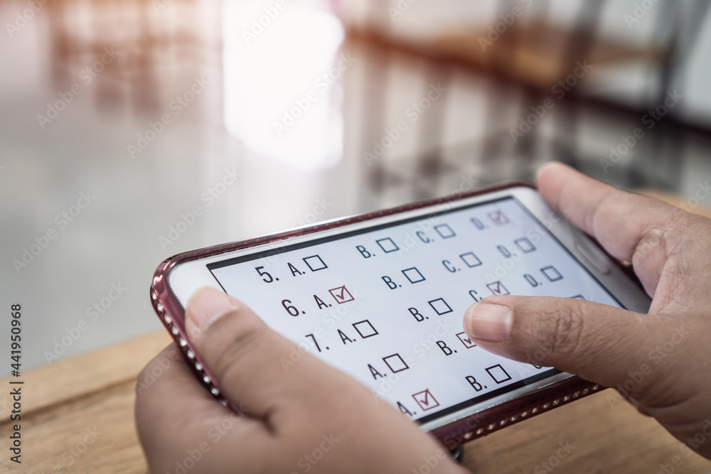 The watermark will not be included on Wall mural.: Student testing e-learning exam on technology smartphone clicking multiple choice questions - educati
