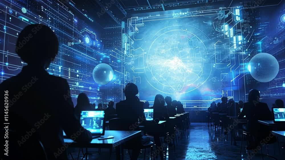 Wall mural : Students are learning programming and software development in a futuristic classroom - illuminated by