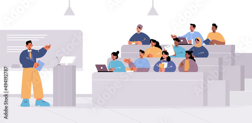 Wall mural students in lecture hall with teacher explain information. learning process in university auditorium