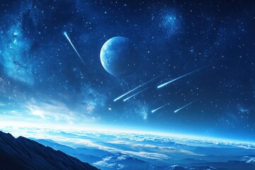 Wall mural stunning depiction of a planet at dawn with a galaxy backdrop and distant celestial bodies illuminat - Wall murals Wall mural stunning depiction of a planet at dawn with a galaxy backdrop and distant celestial bodies illuminat - Wall murals