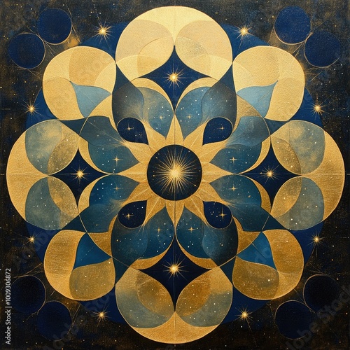 The watermark will not be included on Wall mural.: Stunning geometric design featuring intricate patterns in gold and blue, evoking a sense of harmony