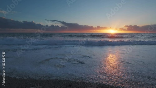 The watermark will not be included on Wall mural.: Stunning sunset over sea with vibrant colors reflecting on the water at the beach, 4k