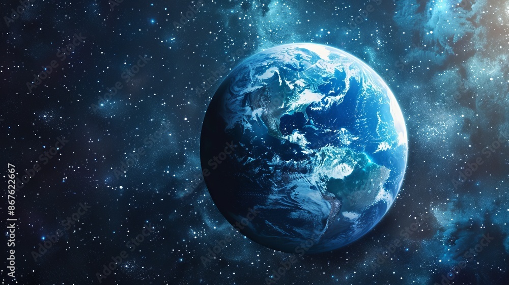 Wall mural : Stunning view of a blue planet from outer space with glowing atmosphere and starry background, ideal