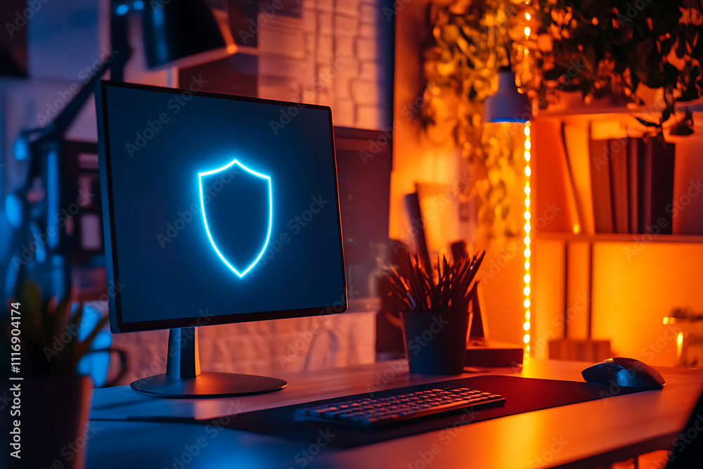 The watermark will not be included on Wall mural.: Stylish modern workstation with security shield display