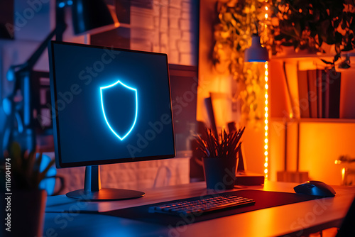 Wall mural stylish modern workstation with security shield display - Wall murals Wall mural stylish modern workstation with security shield display - Wall murals