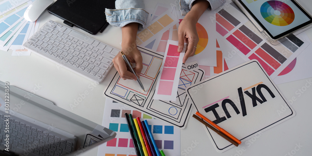 Wall mural : Stylish woman ux designer using digital tablet and computer planning new website wireframe at creati