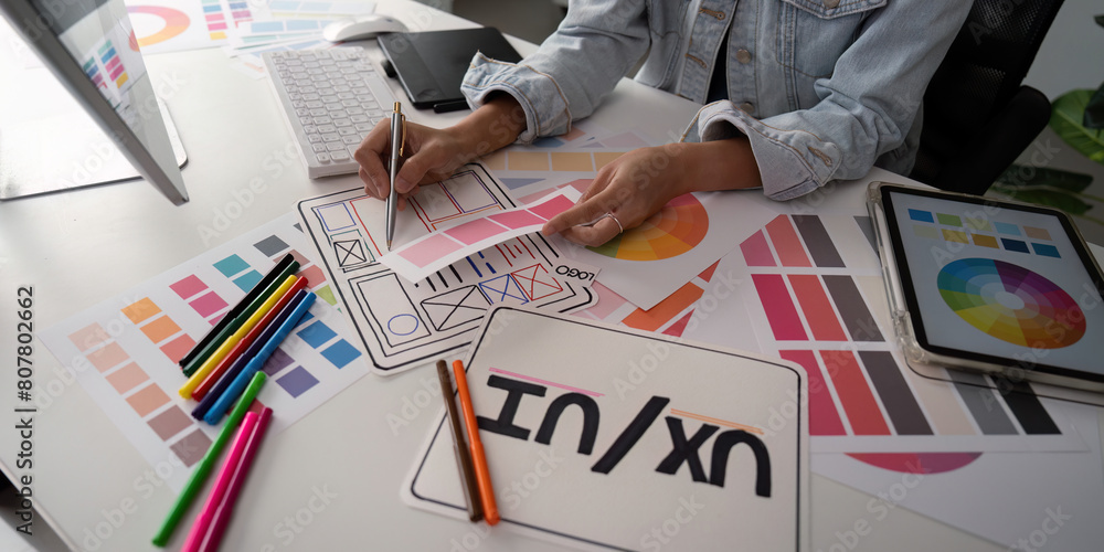Wall mural : Stylish woman ux designer using digital tablet and computer planning new website wireframe at creati