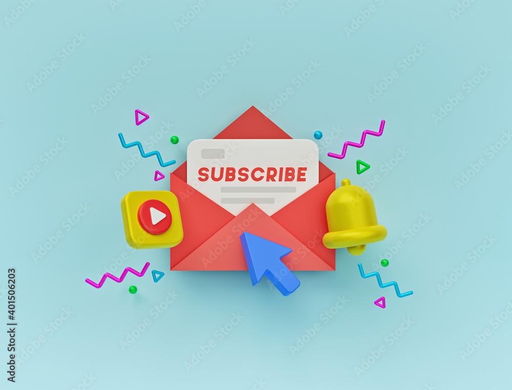 Subscribe newsletter - open mail envelope, play button, bell icon - minimal background for website andWall mural
