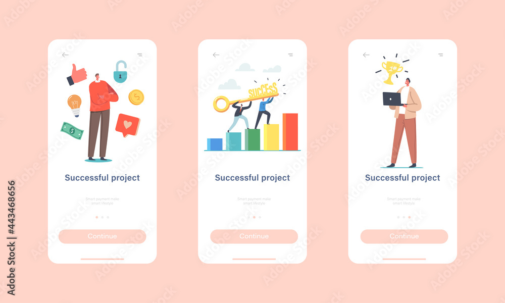 Wall mural successful project mobile app page onboard screen template. tiny businesspeople characters with gold