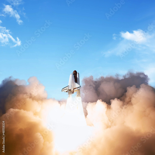 Wall mural successful start of a space mission, concept. shuttle rocket with clouds of smoke takes off into the