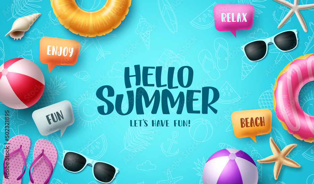 The watermark will not be included on Wall mural.: Summer greeting vector design - hello summer text with colorful beach elements and speech bubbles for