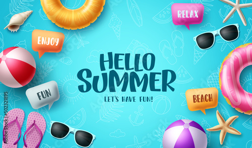 Wall mural : Summer greeting vector design - hello summer text with colorful beach elements and speech bubbles for