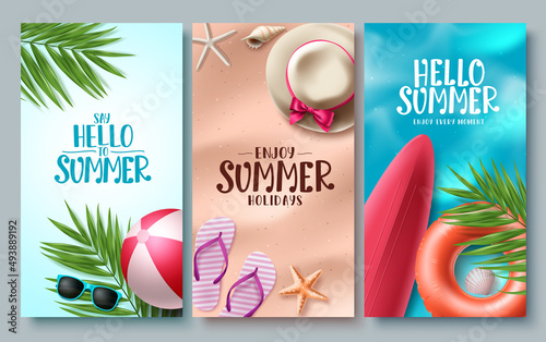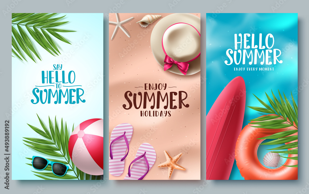 The watermark will not be included on Wall mural.: Summer vector poster set design - hello summer greeting text collection with beach elements for tropi