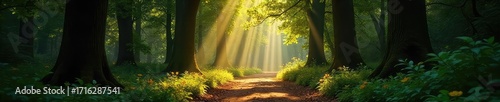 The watermark will not be included on Wall mural.: Sun-dappled forest path winding through ancient trees, sunlight filtering through leaves, creating a