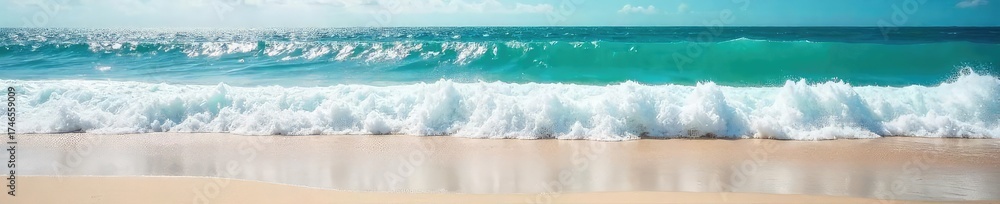 Wall mural sun-drenched beach scene with rolling ocean waves crashing on the shore, creating white foam and sea