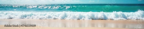 The watermark will not be included on Wall mural.: Sun-drenched beach scene with rolling ocean waves crashing on the shore, creating white foam and sea
