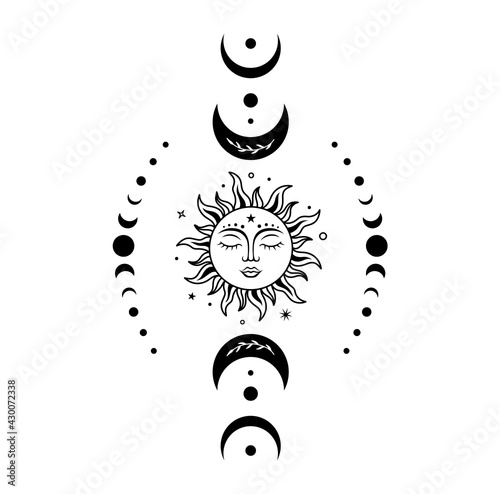The watermark will not be included on Wall mural.: Sun moon vector silhouette design - boho sun with face surrounded by crescent moon and moon phases - v