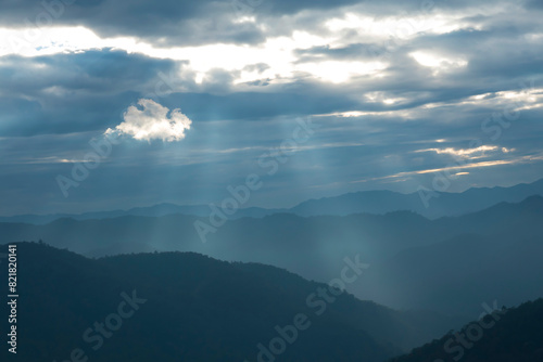 Sun rays filter through the clouds in hills of the valley illuminated by the sun's rays filtering thWall mural