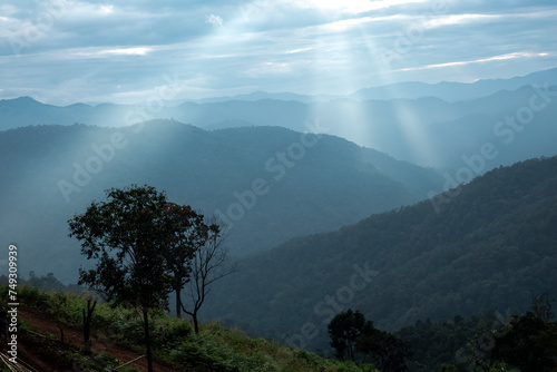 Wall mural sun rays filter through the clouds in hills of the valley illuminated by the sun's rays filtering th