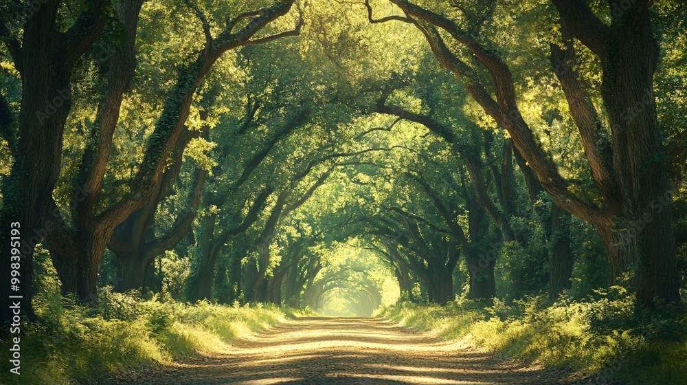 The watermark will not be included on Wall mural.: Sun rays illuminate a path through an archway of trees in a forest -