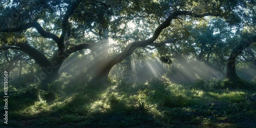 Wall mural : Sunbeams filtering through a dense forest canopy creating a mystical atmosphere -