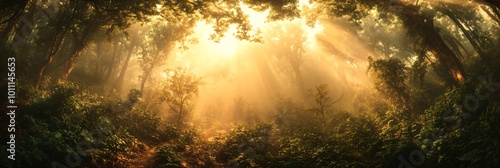 The watermark will not be included on Wall mural.: Sunbeams stream through the dense foliage of a misty forest, creating a magical and ethereal atmosph