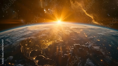 Wall mural : Sunlight ascending over earth in outer space - majestic view of solar rays illuminating planet earth