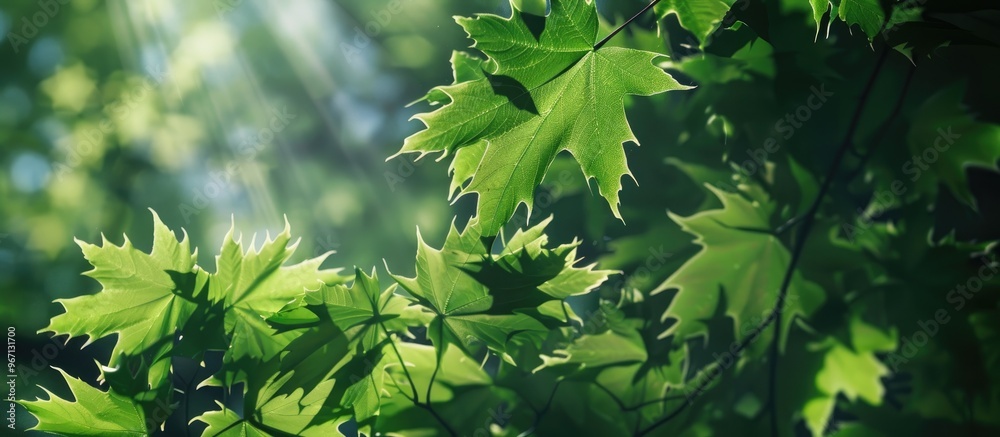 Wall mural : Sunlight filtering through bright green maple leaves casting shadows with copy space image