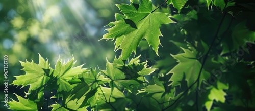 The watermark will not be included on Wall mural.: Sunlight filtering through bright green maple leaves casting shadows with copy space image