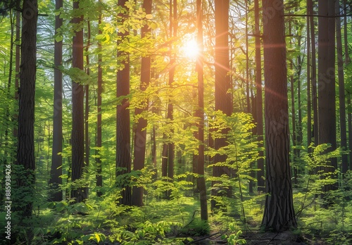 The watermark will not be included on Wall mural.: Sunlight filtering through spring forest